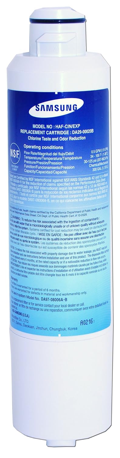 Clean, great tasting water and ice is what you get when you purchase the Samsung DA29-00020B water filter by Cuno. With this filter you are receiving the expertise of a world leader in liquid filtration that has been around for more than 90 years. You can be assured of getting high quality water for your home or your business that is free of harmful contaminants such as chlorine, dirt, rust and other particles, as well as unpleasant odors and tastes. The materials used in this water filter are top quality ensuring that the product lasts longer while filtering away most of the impurities that give water a strange odor and taste. This water filter will also prolong the life of your refrigerator. It was designed to lessen the sediment deposits in your refrigerators ice machine. The filtration process handled by this water filter involves the passing of the water from the exterior surfaces until it goes into the middle of the cartridge. With every filtering layer that the water goes through, the pores of the filters become smaller, so as to get rid of even the most minute particles or impurities in water. It does not remove minerals which may be beneficial to health such as fluoride. The interval of the changing of these filters is dependent on the quality of your water as well as on the water consumption of your entire household. This refrigerator water filter is used in select Samsung French door and side-by-side refrigerators with filter access inside the refrigerator. Samsung DA29-00020B water filter can be used in the system for Model: DA97-08006A-B. Fits Models RS267, RFS265, RS263, RS261, RFG293, RF4287. CUNO Inc. a 3M company, is the Original Equipment Manufacturer (OEM) for Samsung water filters. They are a world leader in the design, manufacture, and marketing of filtration products for the separation, clarification, and purification of fluids and gasses. Its proprietary products are widely used throughout the global healthcare, industrial, and water markets.